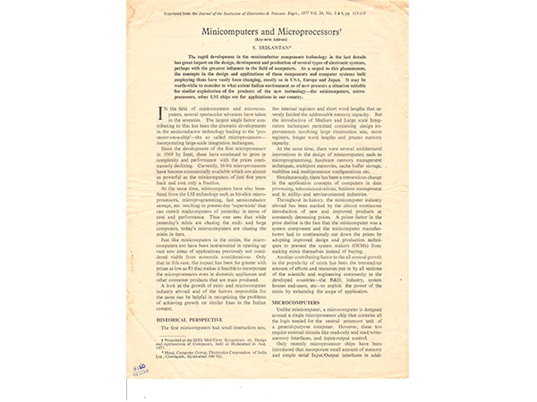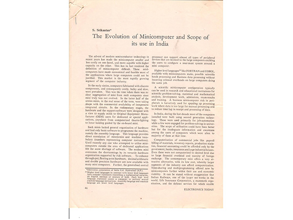 Dr. S. Srikantan in the year 1961 was promoted as a Scientific Officer and was sent to further his studies to the US with the guidance of Dr. Homi J Bhabha and support from the Government of India. He completed his Masters in Electrical Engineering and also completed his Ph.D. from Moore’s collage, University of Pennsylvania in Philadelphia, USA in the year 1964. Dr. S. Srikantan, returned to India after his Ph.D. and led a team of fresh graduated engineers and scientists as a group leader, to work on TDC-12 (Trombay Digital Computer – 12) ‘The first Indian-built electronic digital computer’ commissioned by Vikram Sarabhai at Bhabha Atomic Research Centre, between the year 1964 – 1968 and the computer was released on January 21, 1969.