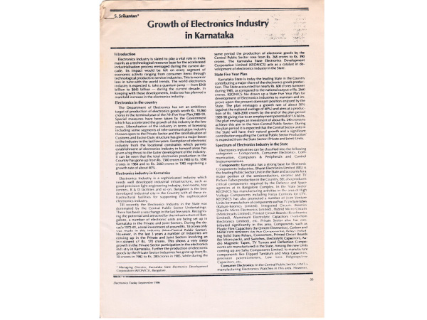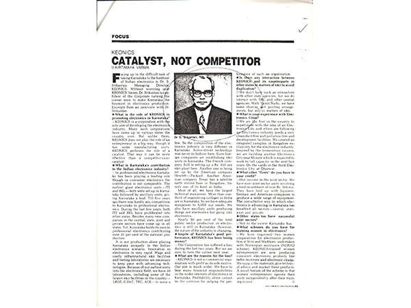 Dr. S. Srikantan worked as a Managing Director from the year 1983 – 1992. This was the period that the electronic industry got a strong hold in Karnataka and contributed a major role for the country’s overall production and export. KEONICS played the major role in putting Karnataka in the world map for Electronics manufacturing and as the outsourcing capital of the world. Dr. S. Srikantan quoted “KEONICS is a catalyst and not a competitor” Under the leadership of Dr. S. Srikantan, KEONICS promoted the private sector electronic industries with the sole aim of developing the electronics industry