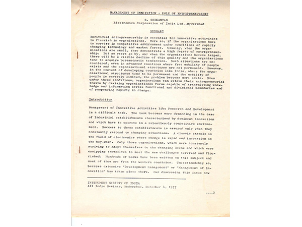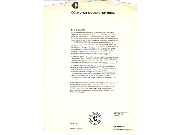 Dr. S. Srikantan in the year 1961 was promoted as a Scientific Officer and was sent to further his studies to the US with the guidance of Dr. Homi J Bhabha and support from the Government of India. He completed his Masters in Electrical Engineering and also completed his Ph.D. from Moore’s collage, University of Pennsylvania in Philadelphia, USA in the year 1964. Dr. S. Srikantan, returned to India after his Ph.D. and led a team of fresh graduated engineers and scientists as a group leader, to work on TDC-12 (Trombay Digital Computer – 12) ‘The first Indian-built electronic digital computer’ commissioned by Vikram Sarabhai at Bhabha Atomic Research Centre, between the year 1964 – 1968 and the computer was released on January 21, 1969.