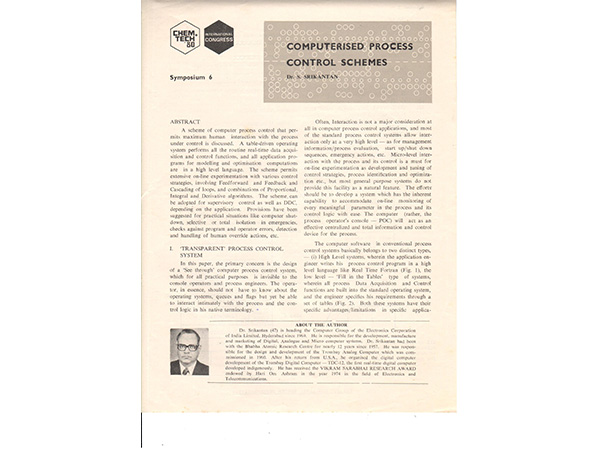Dr. S. Srikantan in the year 1961 was promoted as a Scientific Officer and was sent to further his studies to the US with the guidance of Dr. Homi J Bhabha and support from the Government of India. He completed his Masters in Electrical Engineering and also completed his Ph.D. from Moore’s collage, University of Pennsylvania in Philadelphia, USA in the year 1964. Dr. S. Srikantan, returned to India after his Ph.D. and led a team of fresh graduated engineers and scientists as a group leader, to work on TDC-12 (Trombay Digital Computer – 12) ‘The first Indian-built electronic digital computer’ commissioned by Vikram Sarabhai at Bhabha Atomic Research Centre, between the year 1964 – 1968 and the computer was released on January 21, 1969.