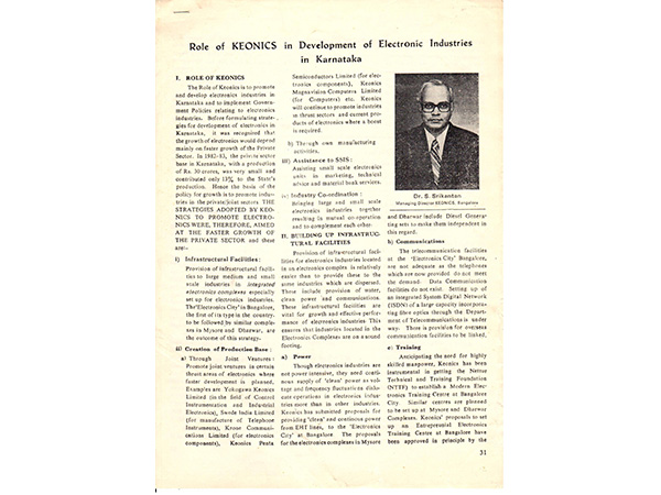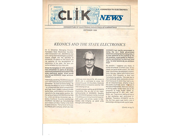 Dr. S. Srikantan worked as a Managing Director from the year 1983 – 1992. This was the period that the electronic industry got a strong hold in Karnataka and contributed a major role for the country’s overall production and export. KEONICS played the major role in putting Karnataka in the world map for Electronics manufacturing and as the outsourcing capital of the world. Dr. S. Srikantan quoted “KEONICS is a catalyst and not a competitor” Under the leadership of Dr. S. Srikantan, KEONICS promoted the private sector electronic industries with the sole aim of developing the electronics industry