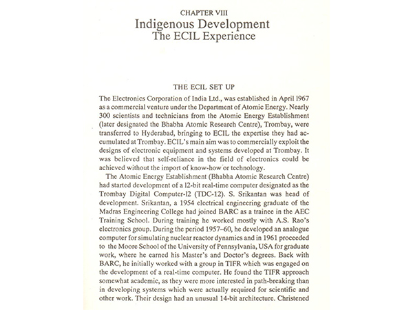 Dr. S. Srikantan was transferred to ECIL from BARC as a Scientific Officer to start the computer division of ECIL as the Head of the division. The main aim was self-reliance in the field of electronics and commercially exploit the designs of electronic equipment developed at Trombay. They started manufacturing digital computers for commercial use under his leadership. He was responsible for introducing a range of digital computers, starting from TDC-12 and eventually to the third generation computers, TDC-312, TDC-316 and TDC-332. He laid the foundation for ECIL as commercial venture which started as a R&D activity at BARC.